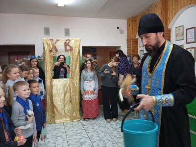 Иерей Сергий Плетежов осветил куличи и яйца, рассказал историю праздника. В активном диалоге ребята узнали, почему пасхальные яйца красят именно в красно – багровый цвет.